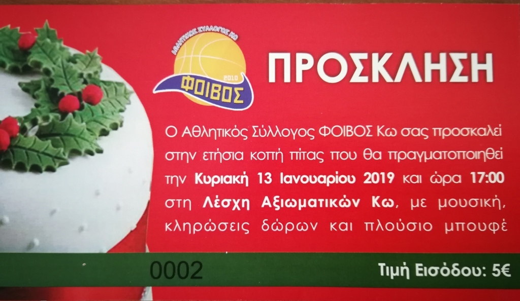 Την Κυριακή 13 Ιανουαρίου θα κόψει τη «βασιλόπιτα» του ο Φοίβος Κω, όπως ανακοίνωσε και επίσημα: «Ο Αθλητικός Σύλλογος Φοίβος Κω σας προσκαλεί στην ετήσια κοπή πίτας, που θα πραγματοποιηθεί την Κυριακή 13 Ιανουαρίου 2019 και ώρα 17:00 στη λέσχη αξιωματικών Κω με μουσική, κληρώσεις δώρων και πλούσιο μπουφέ».
