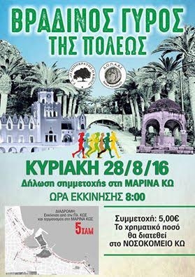 Ενόψει των θερινών Ιπποκρατείων στις 28/08/2016 ο Γ.Σ <<Ο ΙΠΠΟΚΡΑΤΗΣ Ο ΚΩΟΣ>>  και ο ΔΟΠΑΒΣ ΚΩ συνδιοργανώνουν τον <<1ο Ιπποκράτειο βραδινό γύρο της πόλεως Κω>>. Η εκκίνηση θα δοθεί στις 20:00 στην πλατεία Κως και τερματισμός στην Μαρίνα Κως. Η δηλώσεις συμμετοχής θα δίνονται στην Μαρίνα Κω πριν την εκκίνηση.  Η συμμετοχή θα είναι 5€ και το ποσό που θα συγκεντρωθεί από τις συμμετοχές θα δοθεί στο νοσοκομείο της Κω για την κάλυψη των αναγκών του.