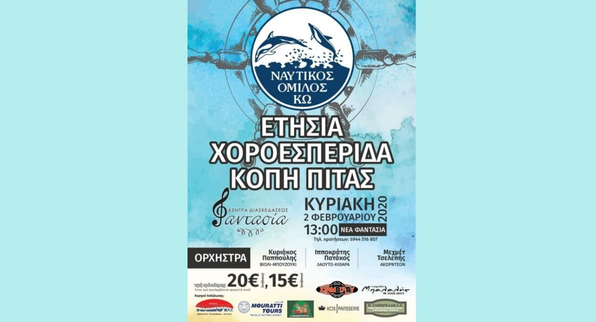 Την Κυριακή 2 Φεβρουαρίου και ώρα 13:00 θα πραγματοποιηθεί η ετήσια χοροεσπερίδα και η κοπή της πίτας του Ναυτικού Ομίλου Κ στη Νέα Φαντασία.