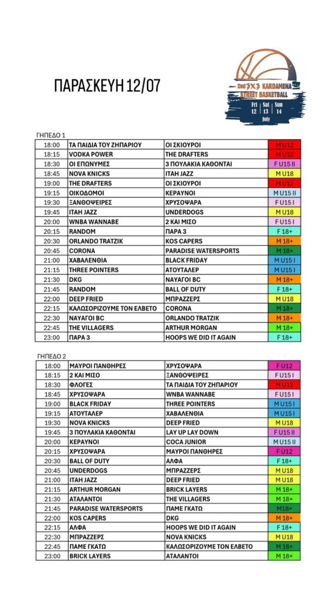 Την Παρασκευή ξεκινάει στο «θεατράκι» στην Καρδάμαινα το 2ο 3×3 Street Basketball που διοργανώνει η ομάδα του Ηρακλή 2000. Οι συμμετοχές των ομάδων είναι αρκετές (42) και ήδη έγινε γνωστό το πρόγραμμα της 1ης ημέρας της διοργάνωσης.