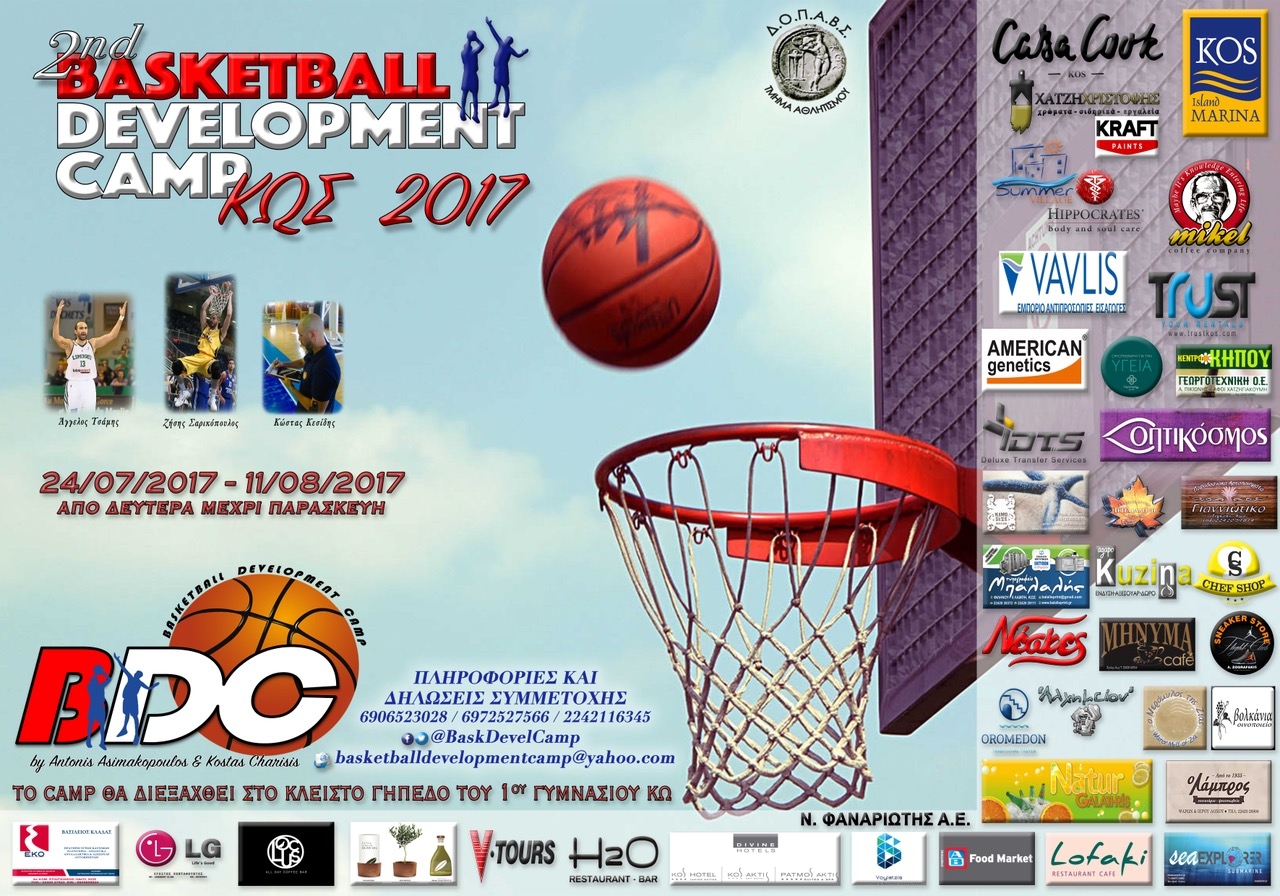 Το BDC, σε συνεργασία πάντα με το Δ.Ο.Π.Α.Β.Σ. (Τμήμα Αθλητισμού), γνωστοποιεί την διεξαγωγή του φετινού 2ου Basketball Development Camp KOS 2017, με βασικό στόχο την βελτίωση της ατομικής τεχνικής στο μπάσκετ, αθλητών ηλικίας 8 ετών και άνω. Το camp, λόγω εργασιών συντήρησης στο δημοτικό κλειστό γυμναστήριο, θα πραγματοποιηθεί στις εγκαταστάσεις του 1ου Γυμνασίου Κω, με ημερομηνία έναρξης την 24η Ιουλίου και με διάρκεια έως και την 11η Αυγούστου. Στο πρόγραμμα των εξειδικευμένων ασκήσεων ισορροπίας, ενδυνάμωσης, νευρομυϊκής συναρμογής και τεχνικής, περιλαμβάνονται πολλά παιχνίδια και διαγωνισμοί, όπως επίσης και σημαντικοί καλεσμένοι.