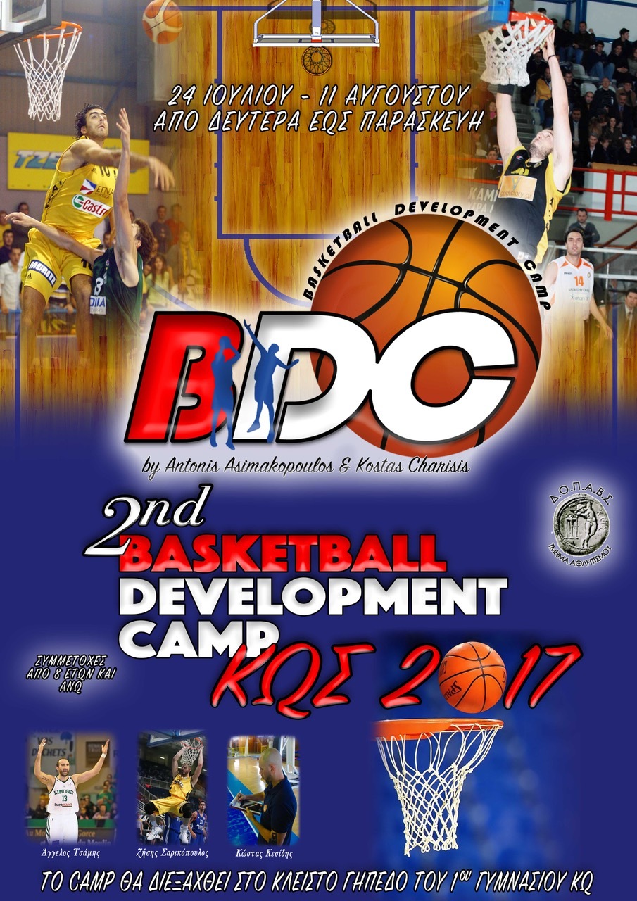 Το BDC, σε συνεργασία πάντα με το Δ.Ο.Π.Α.Β.Σ. (Τμήμα Αθλητισμού), γνωστοποιεί την διεξαγωγή του φετινού 2ου Basketball Development Camp KOS 2017, με βασικό στόχο την βελτίωση της ατομικής τεχνικής στο μπάσκετ, αθλητών ηλικίας 8 ετών και άνω. Το camp, λόγω εργασιών συντήρησης στο δημοτικό κλειστό γυμναστήριο, θα πραγματοποιηθεί στις εγκαταστάσεις του 1ου Γυμνασίου Κω, με ημερομηνία έναρξης την 24η Ιουλίου και με διάρκεια έως και την 11η Αυγούστου. Στο πρόγραμμα των εξειδικευμένων ασκήσεων ισορροπίας, ενδυνάμωσης, νευρομυϊκής συναρμογής και τεχνικής, περιλαμβάνονται πολλά παιχνίδια και διαγωνισμοί, όπως επίσης και σημαντικοί καλεσμένοι.
