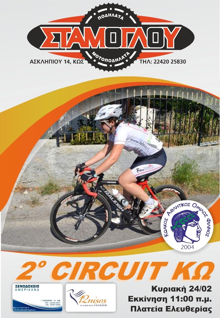 O KAO ΦΙΛΙΝΟΣ ΚΩ σε συνεργασία με την Εμ.Σταμόγλου και υιοί ΟΕ  και την τοπική επιτροπή ποδηλασίας Δωδεκανήσου  διοργανώνει Ποδηλατικό αγώνα με τo όνομα 2ο CIRCUIT Πόλεως Κω την Κυριακή  24 Φεβρουαρίου 2019 και ώρα 10,00 μ.μ.