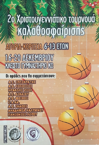 Την παρασκευή 16 Δεκεμβρίου έως και την δευτέρα 20 Δεκεμβρίου ο ΑΣ ΙΠΠΟΚΡΑΤΗΣ ΚΩ με συνδιοργανώνει με τον ΔΟΠΑΒΣ το 2ο ΧΡΙΣΤΟΥΓΕΝΝΙΑΤΙΚΟ ΤΟΥΡΝΟΥΑ ΚΑΛΑΘΟΣΦΑΙΡΙΣΗΣ για αγόρια και κορίτσια 6-13 ετών. Οι αγώνες θα διεξαχθούν όλοι στο κλειστό γυμναστήριο της Κω.