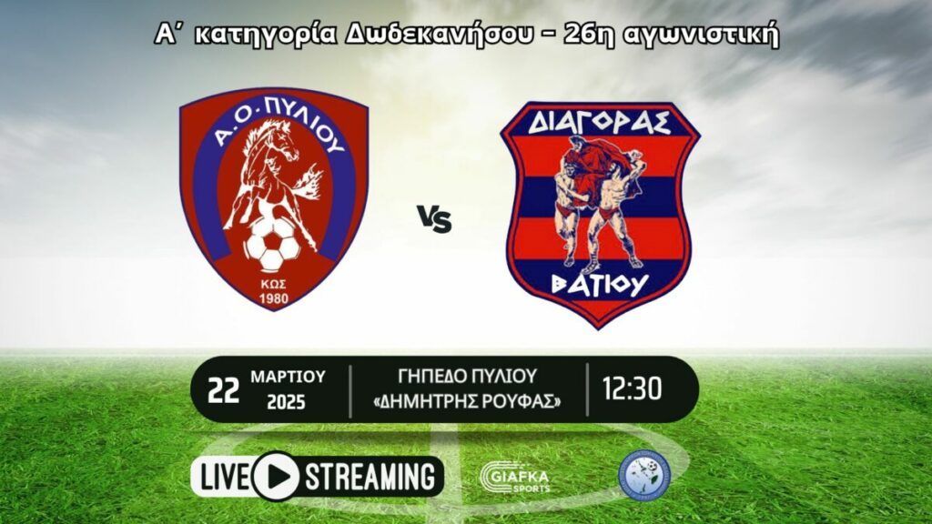 Για την 26η αγωνιστική της Α’ κατηγορίας Δωδεκανήσου ο Α.Ο Πυλίου υποδέχεται το Σάββατο 22/3 στις 12:30 τον Διαγόρα βαρίου. Παρακολουθήστε το ματς σε Live Streaming απ’ το giafkasports.gr