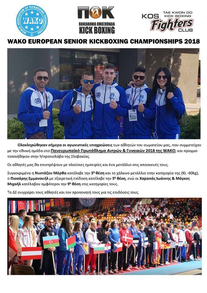 Στο Πανευρωπαϊκό Πρωτάθλημα Kick Boxing της WAKO, που διεξήχθη στη Σλοβακία 13-21/10, πήραν μέρος οι αθλητές του Συλλόγου «Μαχητές της Κω». Ο Μανώλης Πισσάρης, ο Γιάννης Χαραπάς, ο Μιχάλης Μάγκος και η Μάρθα Νυστάζου, ήταν οι Κώοι αθλητές που αγωνίστηκαν με την Εθνική μας ομάδα, οι οποίοι ανταποκρίθηκαν με τον καλύτερο τρόπο, σε μια από τις κορυφαίες διοργανώσεις διεθνώς στο χώρο των μαχητικών σπορ, από πλευράς συμμετοχών και επιπέδου.