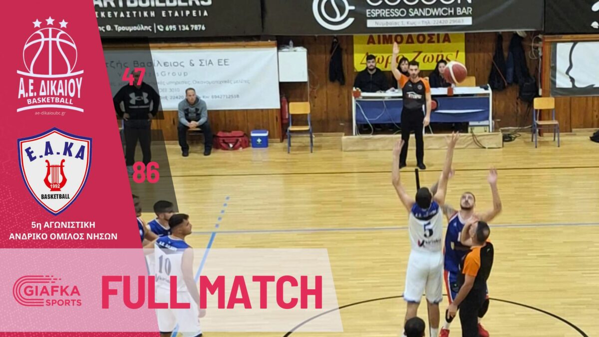 Για την 5η αγωνιστική του ανδρικού πρωταθλήματος του Ομίλου νήσων η Ε.Α.ΚΑ επικράτησε με 47-86 στο Κλειστό γυμναστήριο Κω «Δημήτρης Παππούλης» της Α.Ε Δικαίου με 47-86. Δείτε το ματς απ’ το giafkasports.gr