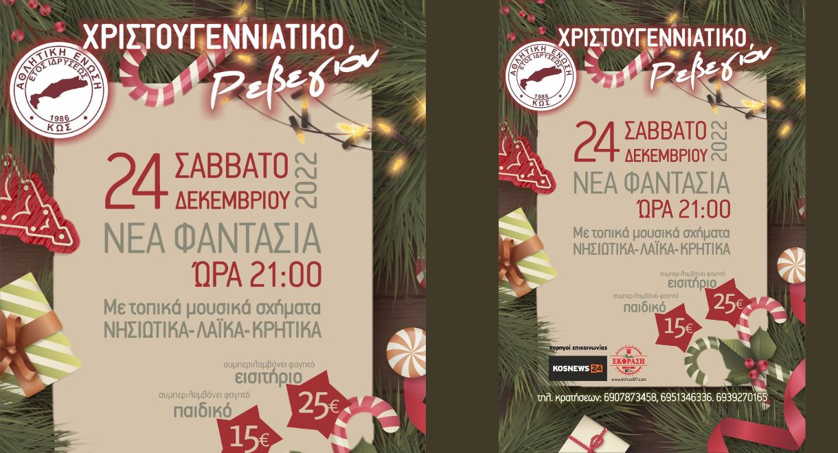 Ρεβεγιόν Χριστουγέννων διοργανώνει η ΑΕ ΚΩΣ το Σάββατο 24 Δεκεμβρίου, στη Νέα Φαντασία με τοπικά μουσικά σχήματα.