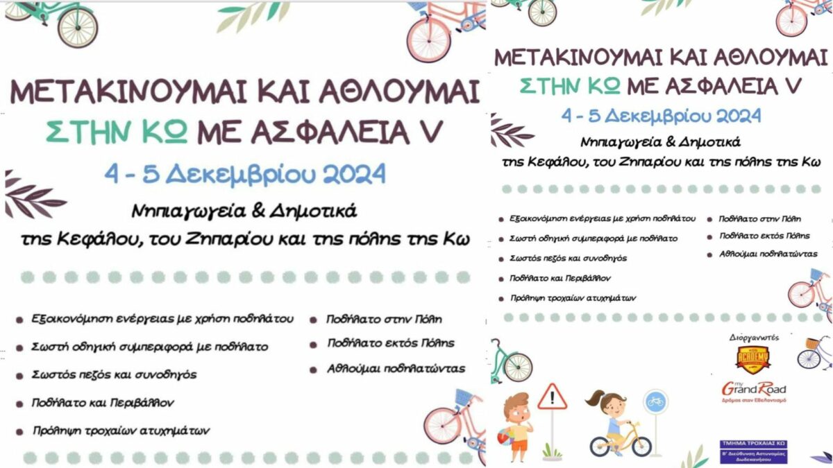 Η δράση «Μετακινούμαι και Αθλούμαι στην Κω με Ασφάλεια V» θα λάβει χώρα την Τετάρτη και την Πέμπτη, 4 και 5 Δεκεμβρίου.