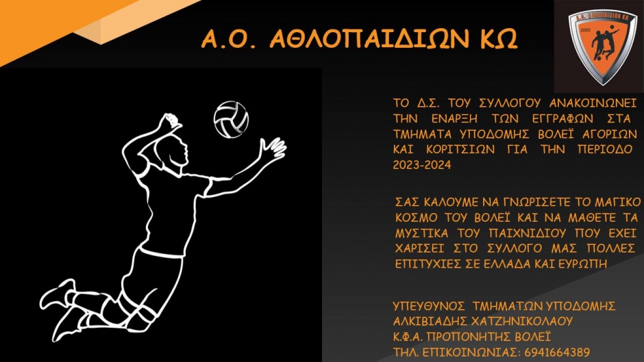 Το τμήμα βόλεϊ του Α.Ο. Αθλοπαιδιών Κω, ανακοινώνει την έναρξη των εγγραφών στα τμήματα υποδομής αγοριών και κοριτσιών για την περίοδο 2023-2024.