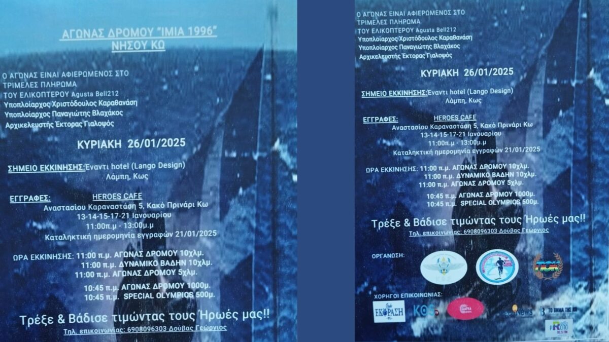 Ο νέος συλλογος δρομέων Κω, συστήνεται σιγά σιγά και διοργανώνει μαζί με τον Ποδηλατικό Όμιλος Κω – Kos Cycling Club αγώνα τρεξίματος 5χμ και 10χμ όπως και δυναμικό βάδην στην περιοχή της Λάμπης στις 26 του Γενάρη προς τιμή των 3 ηρωικών ψυχών που επέβαιναν στο μοιραίο ελικόπτερο που έπεσε στην περιοχή των Ιμιων. Η συμμετοχή είναι δωρεάν.
