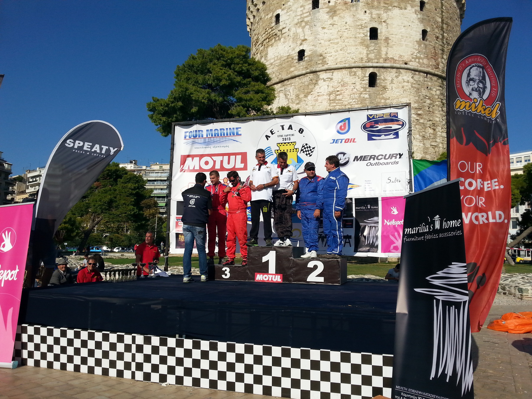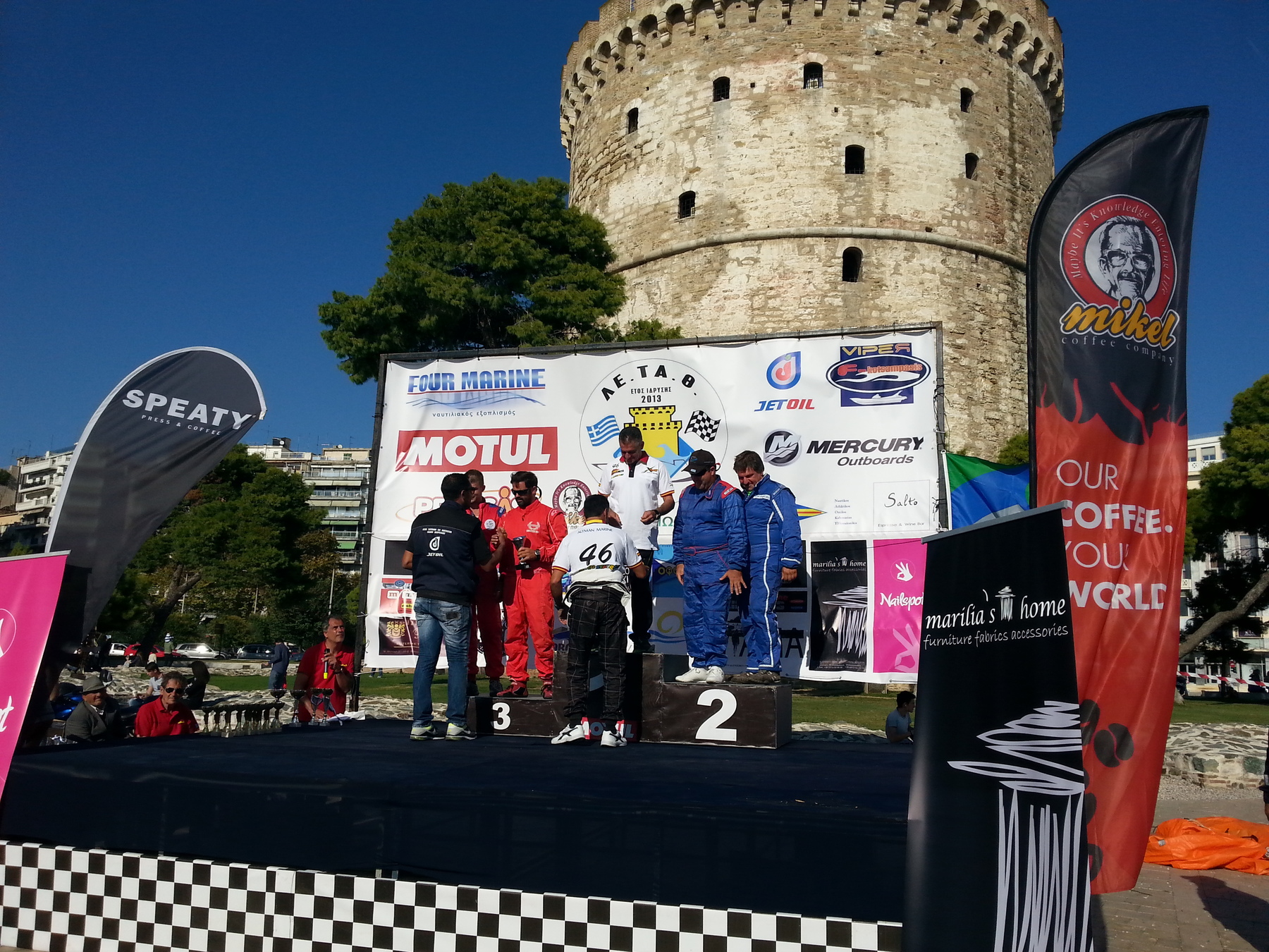 Στo πλαίσιo του πανελληνίου πρωταθλήματος ταχυπλόων σκαφών και τζετ σκι στον Λευκό Πύργο, στη Θεσσαλονίκη όπου διοργάνωσε η Λέσχη Ταχυπλοΐας Θεσσαλονίκης στις 27-28 Σεπτέμβριου 2014 έλαβαν μέρος η συμπατριώτες μας και λάτρεις του αθλήματος των αγωνιστικών μηχανοκίνητων σκαφών, Νιοκαστρίτης Σταμάτης και Φιλίππου Παρασκευάς. Οι προαναφερθέντες είναι μέλη του ομίλου «ΤΡΙΤΩΝΕΣ racing team» του ομίλου υποβρύχιου ψαρέματος και φουσκωτών σκαφών Κω. Αγωνίστηκαν με το σκάφος «Βίκυ» του τύπου top line corsair 29.