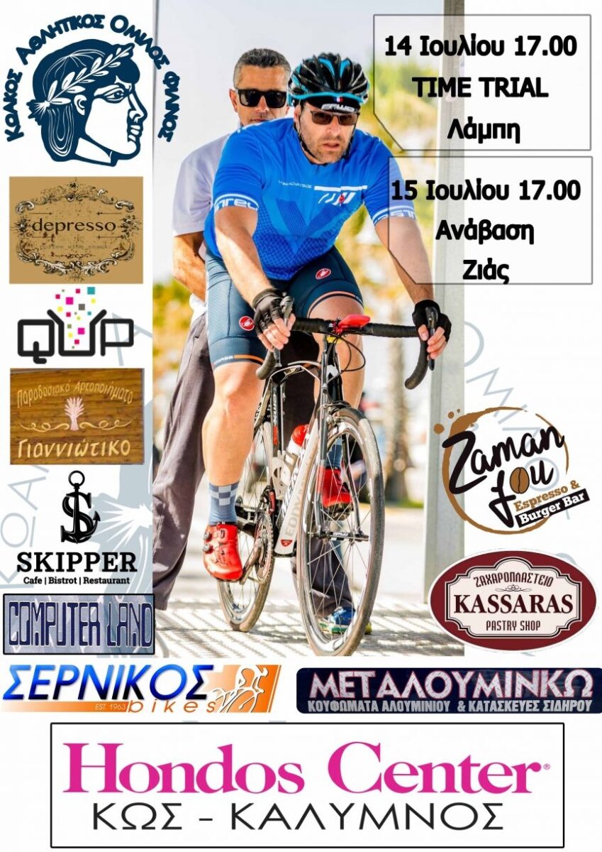 Διοργανώνεται από τον KAO ΦΙΛΙΝΟΣ με τη βοήθεια του ΔΟΠΑΒΣ του δήμου Κω , στο νησί της Κω διπλός ποδηλατικός αγώνας δρόμου Το Σάββατο 14/7 στις 17,00 TIME TRIAL (αγώνας χρονομέτρου) (περιοχή Λάμπη λίγο μετά απο το ξενοδοχείο AQUA BLUE ) (γραμματεία στις 16:00 στο SKIPPER CAFE) και τη Κυριακή 15/7 στις 17,00 .Γραμματεία στο ΖΑΜΑΝ FU CAFE στις 16,00 αγώνας ανάβασης Ζιάς από Ζηπάρι.