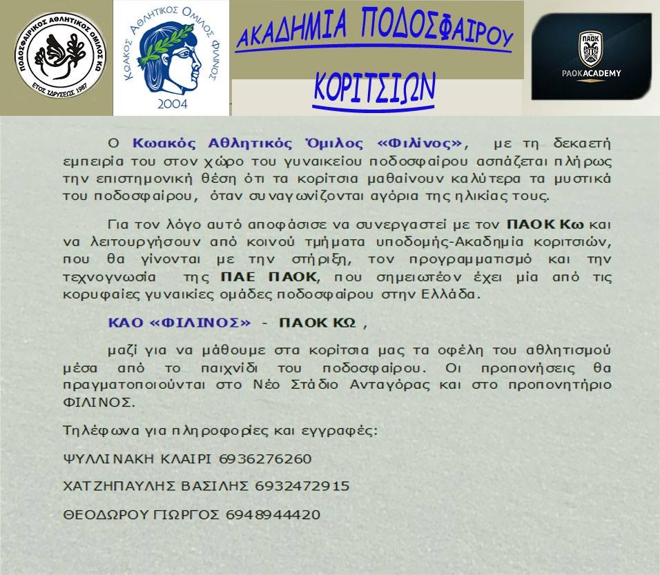 Για τον λόγο αυτό αποφάσισε να συνεργαστεί με τον ΠΑΟK Κω και να λειτουργήσουν από κοινού τμήματα υποδομής-Ακαδημία κοριτσιών, που θα γίνονται με την στήριξη, τον προγραμματισμό και την τεχνογνωσία της ΠΑΕ ΠΑΟΚ, που σημειωτέον έχει μία από τις κορυφαίες γυναικείες ομάδες ποδοσφαίρου στην Ελλάδα.