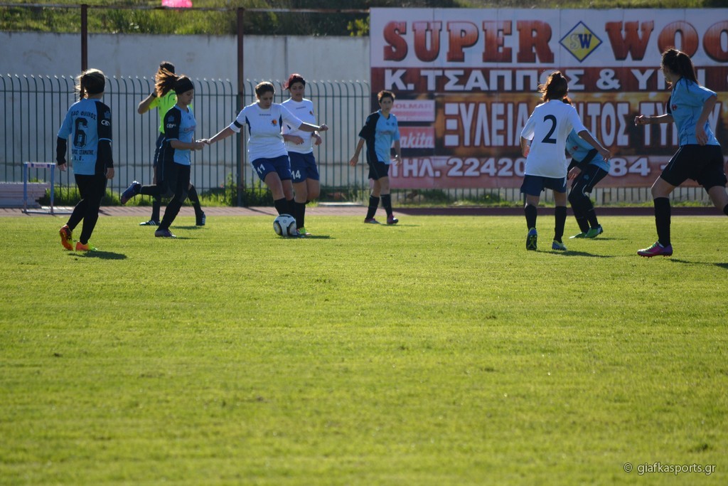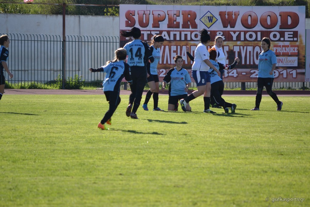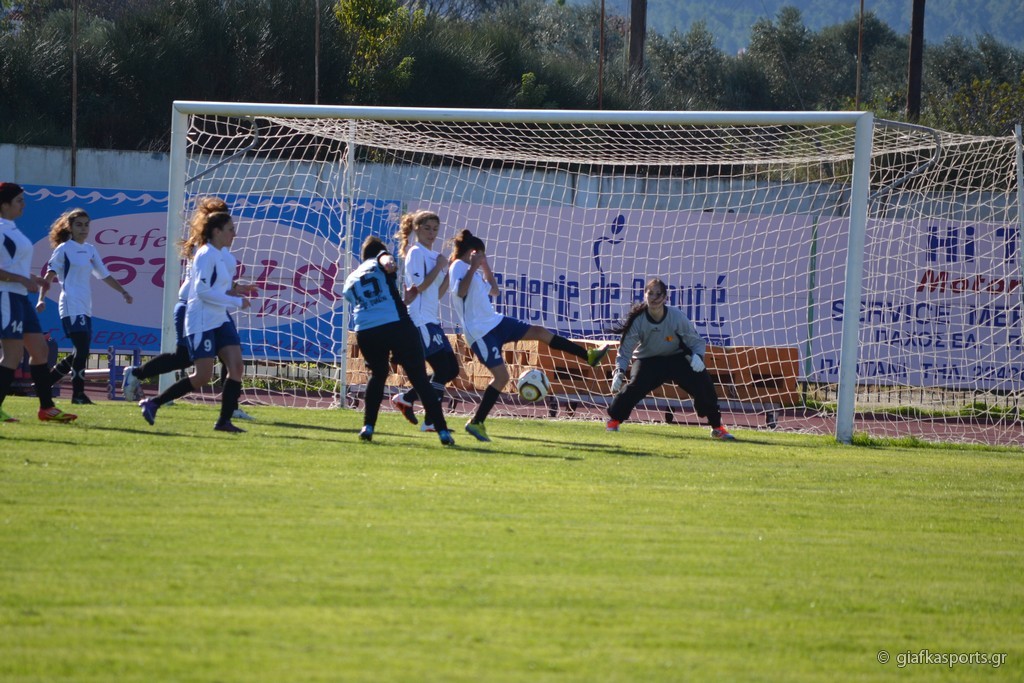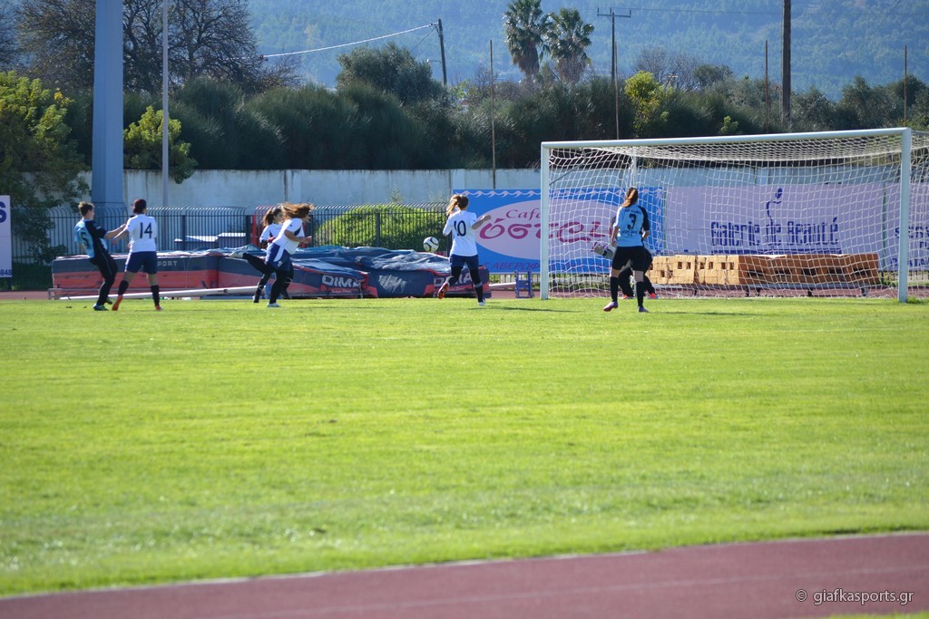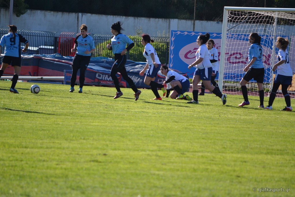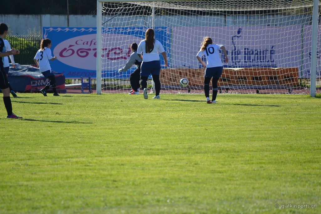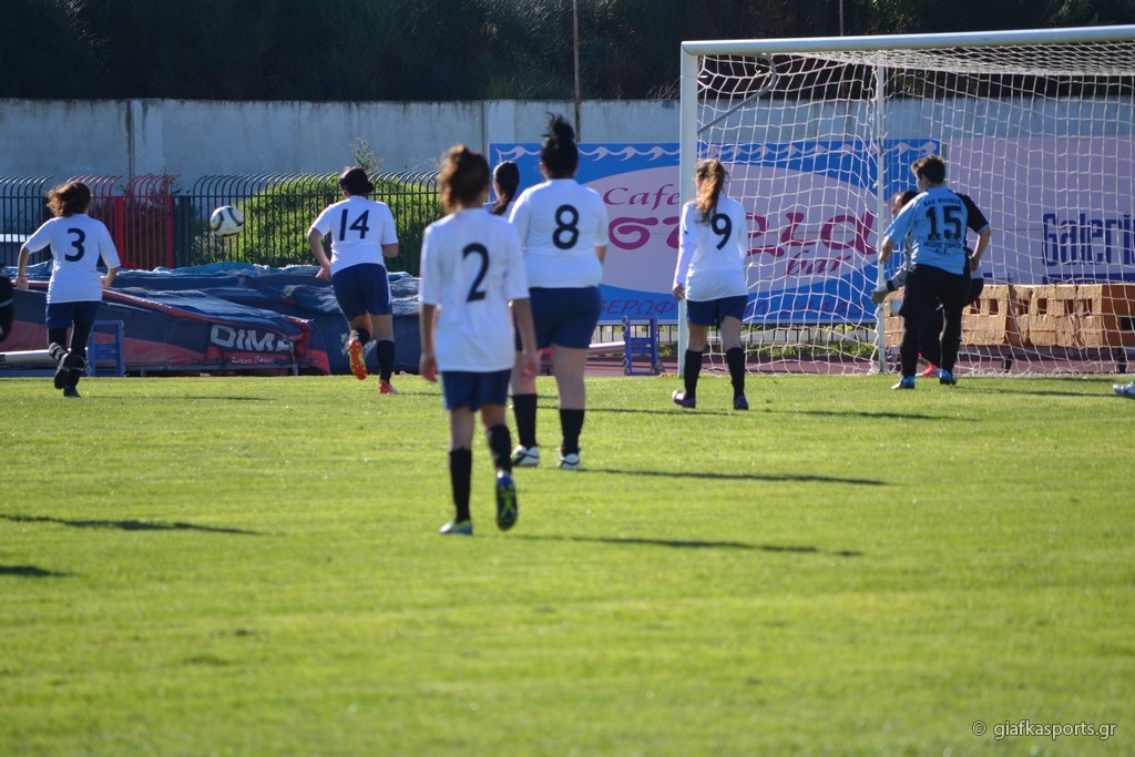 Τα γκολ άρχισαν από το 5ο λεπτό για το Φιλίνο, με την Κορκή να ανοίγει το σκορ με ένα δυνατό σουτ από τα αριστερά. Στο 14 ήρθε το δεύτερο γκολ από την Ιντζιρλή σουτάροντας ευθύβολα επίσης από τα αριστερά. Δύο λεπτά αργότερα η Νικολοπούλου κάνει το 3-0 έπειτα από εκτέλεση πέναλτι που κέρδισε η ίδια. Στο 18ο λεπτό και πάλι η Ιντζιρλή έπειτα από πολλές εναλλαγές της κατοχής της μπάλας σημειώνει το τέταρτο γκολ. Εννέα λεπτά μετά στο 27 η Κορκή μέσα από την περιοχή κάνει το 5-0 μετά από ωραίο γέμισμα της Γερασίμου. Το 6-0 ήρθε από την Γερασίμου με ένα όμορφο μακρινό σουτ στο 38. Τρία λεπτά αργότερα η Ιντζιρλή εκμεταλλεύτηκε την ευκαιρία από το δυνατό σουτ της Νικολοπούλου που χτύπησε στο οριζόντιο δοκάρι της Ορφανού και έβαλε το 7ο και τελευταίο γκολ του πρώτου μέρους.