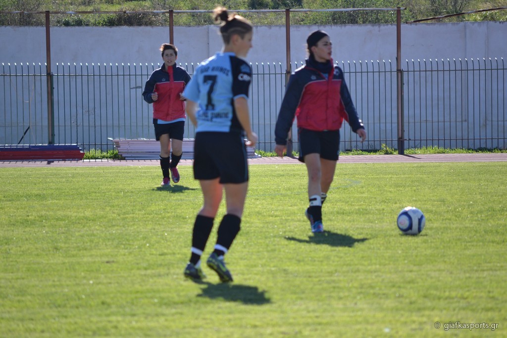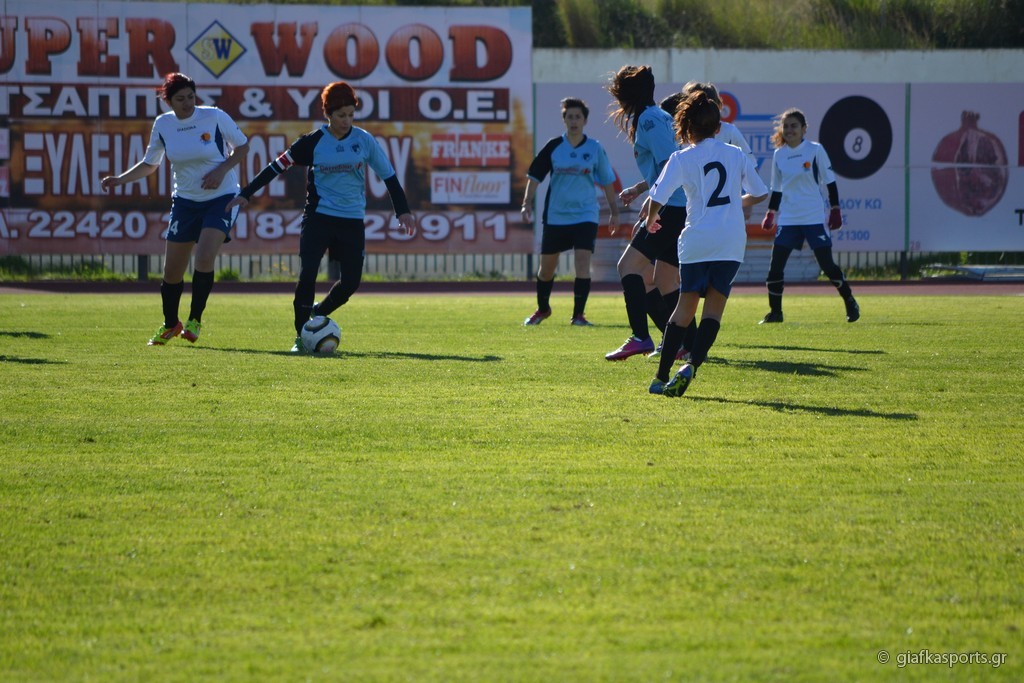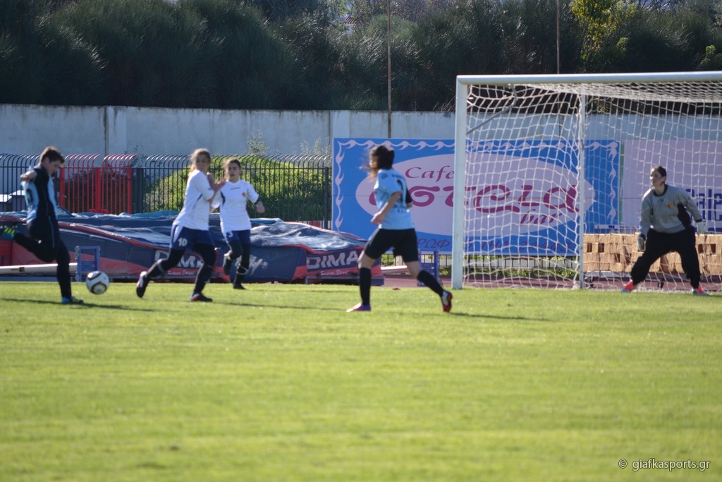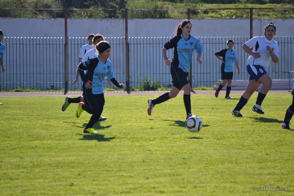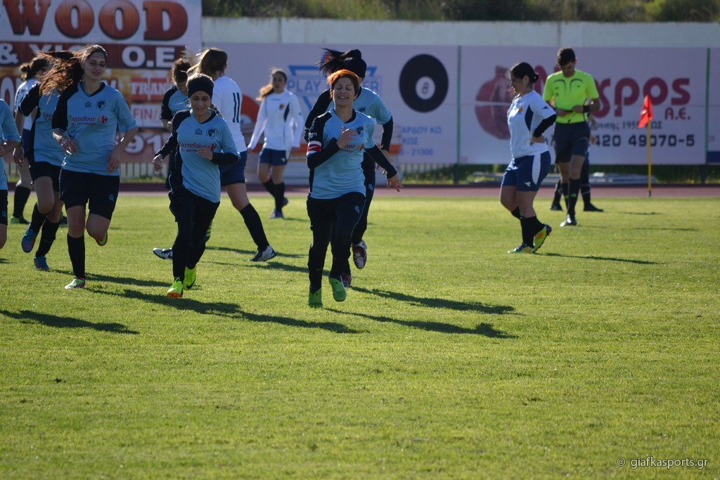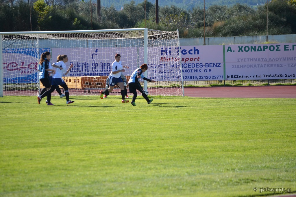 Τα γκολ άρχισαν από το 5ο λεπτό για το Φιλίνο, με την Κορκή να ανοίγει το σκορ με ένα δυνατό σουτ από τα αριστερά. Στο 14 ήρθε το δεύτερο γκολ από την Ιντζιρλή σουτάροντας ευθύβολα επίσης από τα αριστερά. Δύο λεπτά αργότερα η Νικολοπούλου κάνει το 3-0 έπειτα από εκτέλεση πέναλτι που κέρδισε η ίδια. Στο 18ο λεπτό και πάλι η Ιντζιρλή έπειτα από πολλές εναλλαγές της κατοχής της μπάλας σημειώνει το τέταρτο γκολ. Εννέα λεπτά μετά στο 27 η Κορκή μέσα από την περιοχή κάνει το 5-0 μετά από ωραίο γέμισμα της Γερασίμου. Το 6-0 ήρθε από την Γερασίμου με ένα όμορφο μακρινό σουτ στο 38. Τρία λεπτά αργότερα η Ιντζιρλή εκμεταλλεύτηκε την ευκαιρία από το δυνατό σουτ της Νικολοπούλου που χτύπησε στο οριζόντιο δοκάρι της Ορφανού και έβαλε το 7ο και τελευταίο γκολ του πρώτου μέρους.