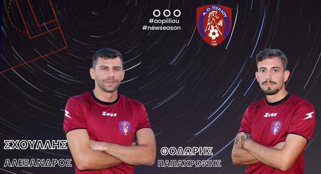 Και επίσημα ανακοίνωσε τους ποδοσφαιριστές Αλέξανδρο Σχουλλή και Θοδωρή Παπαχρόνη η ομάδα του Α.Ο Πυλίου για τη νέα αγωνιστική περίοδο στο πρωτάθλημα της Γ’ Εθνικής.