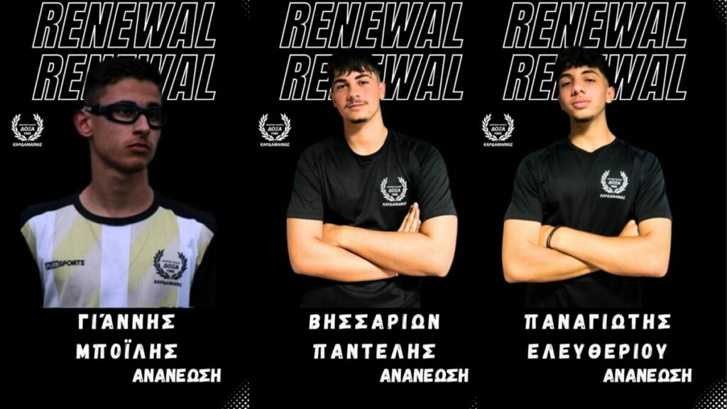 Η Δόξα Καρδάμαινας ανακοινώνει με χαρά την παραμονή των νεαρών ποδοσφαιριστών Γιάννη Μποϊλή, Βησσαρίων Παντελή και Παναγιώτη Ελευθερίου οι οποίοι πέρυσι ανέβηκαν στην ανδρική ομάδα και καθιερώθηκαν στην κατηγορία. Η συμβολή τους στον ημιτελικό του Κυπέλλου Δωδεκανήσου επιβεβαιώνει την αξία τους. Συνεχίζουμε να στηρίζουμε και να επενδύουμε στο μέλλον της ομάδας. Τους ευχόμαστε υγεία, πρόοδο και μια ακόμη δυνατή σεζόν με τη φανέλα της Δόξας.