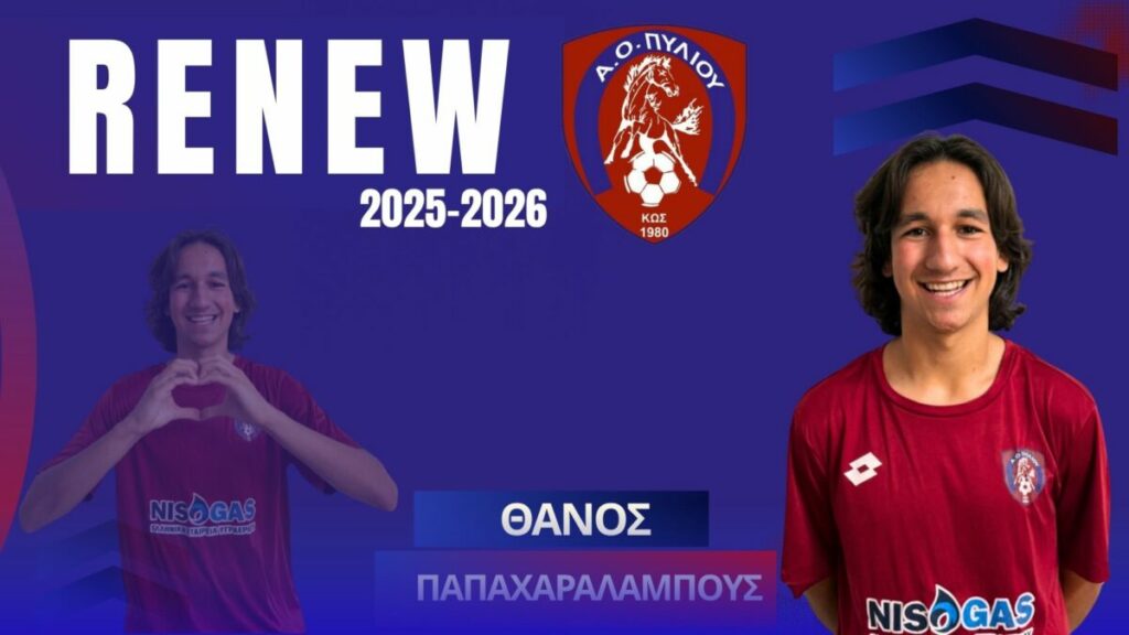 «Ο Α.Ο Πυλίου Κω ανακοινώνει την ανανέωση της συνεργασίας με τον ποδοσφαιριστή Θάνο Παπαχαραλάμπους για την ποδοσφαιρική περιόδο 2025-2026. Ο 17χρονος ποδοσφαιριστής βοήθησε τα μέγιστα στην προσπάθεια της ομάδας μας στο δεύτερο μισό του περσινού πρωταθλήματος και είμαστε χαρούμενοι που ένας αθλητής με την ποιότητα και το ήθος του Θάνου παραμένει στην οικογένεια μας. Του ευχόμαστε μια γεμάτη σεζόν χωρίς τραυματισμούς και να πετύχει τους στόχους του και με την ομάδα και με τις Πανελλήνιες εξετάσεις του».