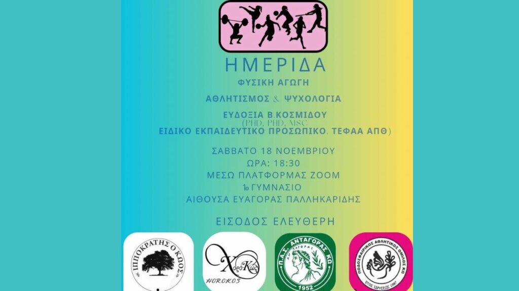 Την εισήγηση θα κάνει η κυρία Ευδοξία Κοσμίδου, ειδικό εκπαιδευτικό προσωπικό του τμήματος επιστήμης φυσικής αγωγής και αθλητισμού μέσω της πλατφόρμας Zoom.