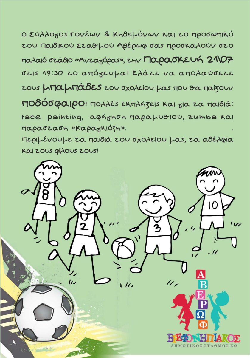 Η επιτροπή βετεράνων ποδοσφαιριστών καλεί όλους τους βετεράνους ποδοσφαιριστές του νησιού να δώσουν το παρών σε φιλικό αγώνα με τους γονείς των βρεφονηπιακών σταθμών την Παρασκευή 21 Ιουλίου στο παλιό στάδιο Ανταγόρας.