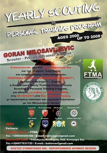 Ανακοινώνεται από τον Π.Α.Σ. Ανταγόρα Κω και την εταιρεία διαχείρισης και εκπροσώπησης ποδοσφαιριστών, “FOOTBALL TALENT & MANAGEMENT AGENCY”, με έδρα το Βελιγράδι – Σερβία, η διοργάνωση Yearly Training Camp & Yearly Scouting and Personal Training Program“, για αθλητές γεννηθείς το 2000 έως 2008, στις 06-10/06/2017,στο Νέο Στάδιο Ανταγόρα, με προπονήσεις τακτικών και τεχνικών δεξιοτήτων με τον Milosavljevic Goran,παρουσία του αρχηγού της ομάδας του Ερυθρού Αστέρα Βελιγραδίου – U19 – PETROVIC DJORJDE.