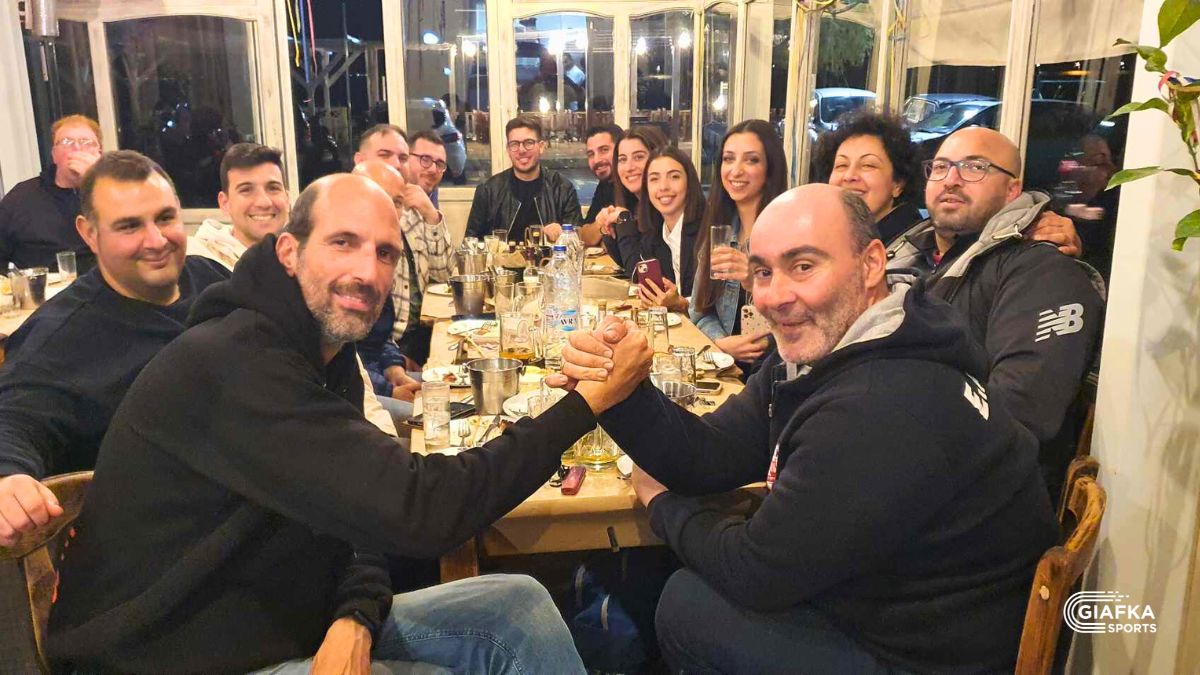 Μπορεί αύριο να είναι αντίπαλοι στον τελικό των κορασίδων και να έδωσαν “μάχη” πριν μερικές μέρες για την πρόκριση στον τελικό των νεανίδων αλλά οι άνθρωποι της Ε.Α.ΚΑ και του Ηρακλή 2000 πέρασαν μαζί την βραδιά τους μετά τους ημιτελικούς παρέα και με τους διαιτητές Άρη Φάκαρο και Γιώργο Τζανετάκη δοκιμάζοντας τις νοστιμές του νέου μεζεδοπωλείου «Το ταβερνάκι».