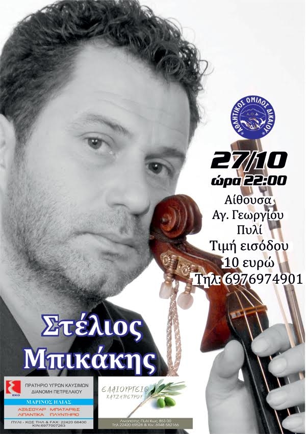 Ο Α.Ο. ΔΙΚΑΙΟΥ σας καλεί στην χοροεσπερίδα που διοργανώνει την Πέμπτη 27 Οκτωβρίου με τον Στέλιο Μπικάκη και το συγκρότημα του, στην αίθουσα Αγ. Γεωργίου στο Πυλί.