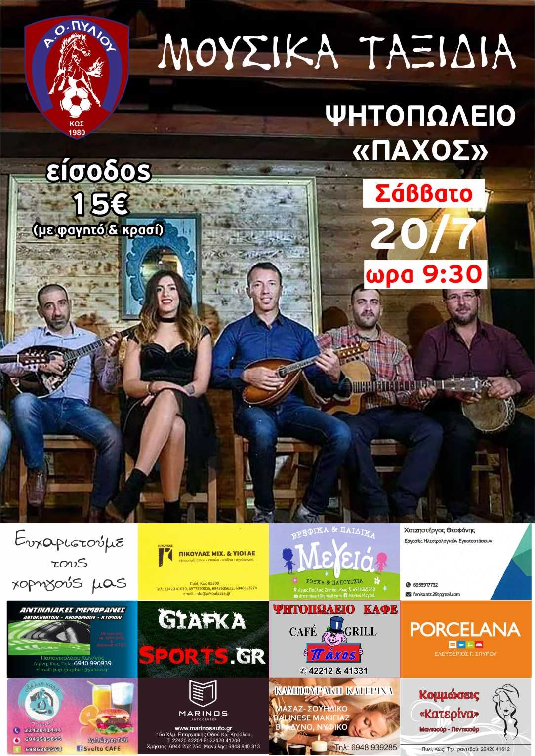 «Ο Α.Ο Πυλίου σας προσκαλεί το Σάββατο 20 Ιουλίου και ώρα 21:30 στον προάυλιο χώρο του Ψητοπωλείου «Πάχος» για μια μουσική βραδιά, με φαγητό και κρασί και καλεσμένους μας τα «Μουσικά ταξίδια».
