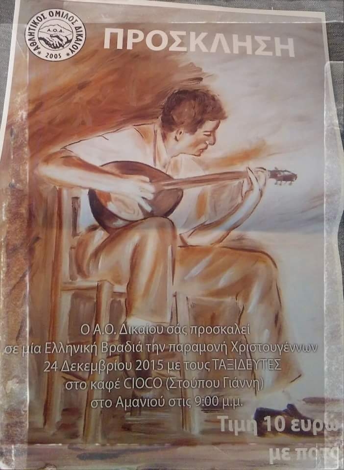 Ο Α.Ο Δικαίου σας προσκαλεί σε μια μουσική βραδιά με τους Ταξιδευτές σήμερα παραμονή Χριστούγεννων στο Cioco καφέ στο Αμανιού.