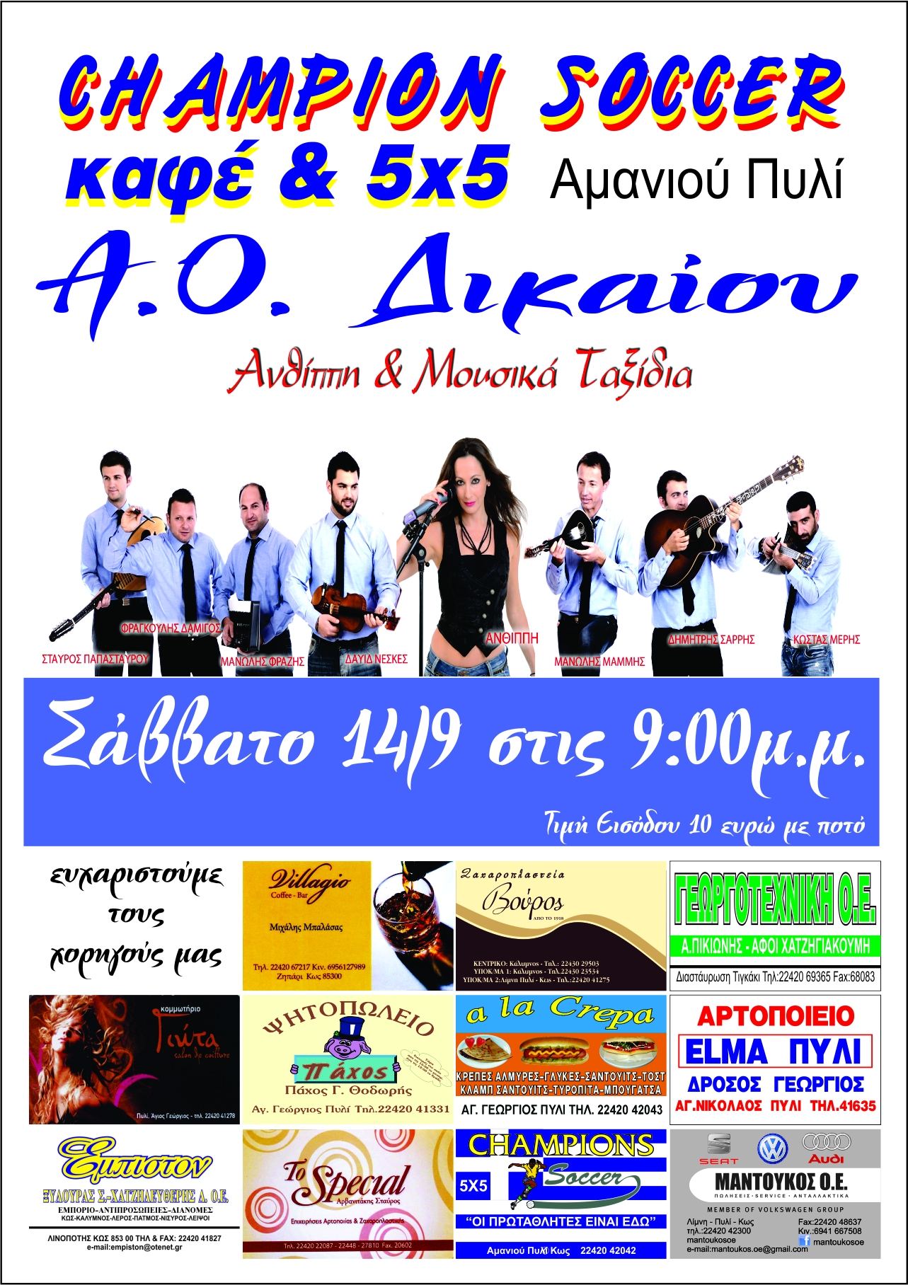 Ο Α.Ο Δικαίου σας προσκαλεί το Σάββατο 14 Σεπτεμβρίου και ώρα 21:00 στο Champion Soccer στο Αμανιού για να διασκεδάσετε ακούγοντας την Ανθίππη και τα Μουσικά ταξίδια.