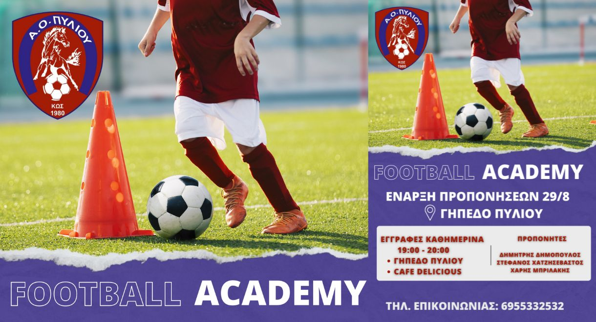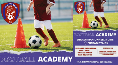 Απ’ την Δευτέρα 29/8 ξεκινούν οι εγγραφές στην ακαδημία της ομάδας μας και οι γονείς θα μπορούν να κάνουν την εγγραφή τους είτε στα γραφεία του συλλόγου, στο γήπεδο Πυλίου καθημερινά 19:00 – 20:00 είτε στο Cafe Delicious. Τηλ. επικοινωνίας: 695 533 2532