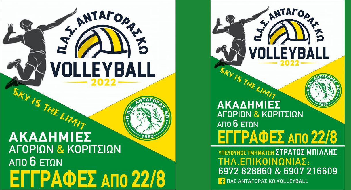 Απ’ τις 22 Αυγούστου θα ξεκινήσουν οι εγγραφές για το τμήμα βόλεϊ του Ανταγόρα για τη νέα χρονιά για αγόρια και κορίτσια από 6 ετών και πάνω.
