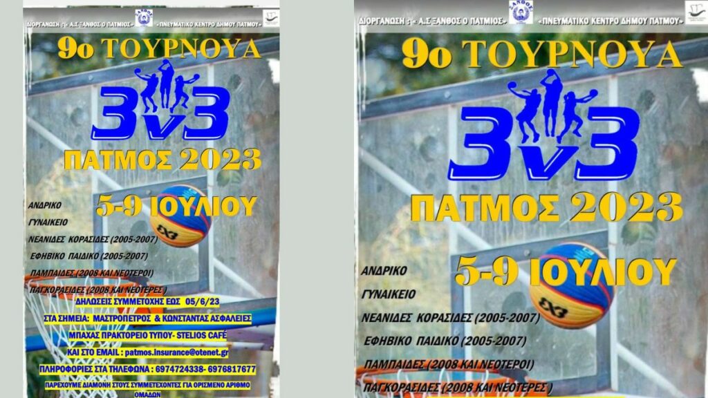 Το τουρνουά διοργανώνουν ο Ξάνθος Πάτμου και το πνευματικό κέντρο του Δήμου Πάτμου και αφορά τις εξής κατηγορίες: Ανδρικό, γυναικείο, νεανίδες- κορασίδες (2005-07), έφηβοι- παίδες (2005-07), παμπαίδες- παγκορασίδες (2008 και νεότεροι). Οι δηλώσεις συμμετοχής θα γίνονται δεκτές μέχρι 5 Ιουνίου στα εξής σημεία: Μαστροπέτρος & Κωνσταντάς ασφάλειες, Μπαχάς πρακτορείο Τύπου και Stelios Café και στο e-mail: [email protected]. Πληροφορίες στα τηλέφωνα: 6974724338 και 6976817677. Οι διοργανωτές παρέχουν δωρεάν διαμονής σε ορισμένο αριθμό συμμετεχόντων
