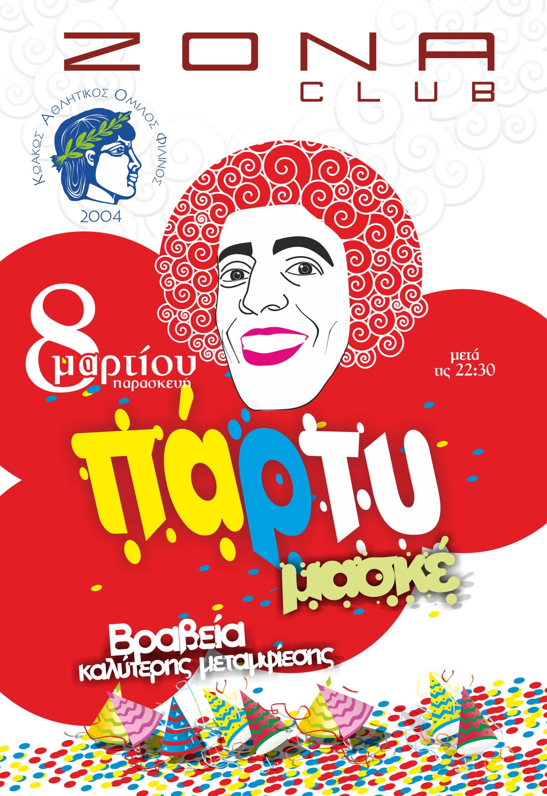 Σας καλούμε στο Αποκριάτικο Πάρτυ μας στις 8 Μαρτίου, 2013 στο ZONA CLUB. Θα υπάρχουν βραβεύσεις για τις καλύτερες μεταμφιέσεις.