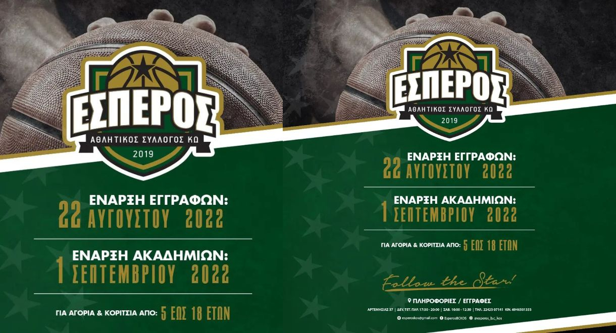 ”Ο Α.Σ. Έσπερος Κω ανακοινώνει την έναρξη εγγραφών, για την περίοδο 2022-23, τη Δευτέρα 22 Αυγούστου 2022. Οι εγγραφές θα πραγματοποιούνται στο γραφείο του συλλόγου κατά τις ώρες λειτουργίας του. Δευτέρα- Τετάρτη- Παρασκευή  17:30-20:00 και Σάββατο  10:00-12:30. Οι προπονήσεις όλων των τμημάτων ξεκινούν 1 Σεπτεμβρίου και αφορούν αγόρια και κορίτσια ηλικίας 5-18 ετών. Τηλ. 2242307141 (Γραφείο) και κινητό 6946501333 (Χατζηστέργος Δημήτρης)”.