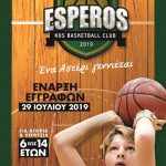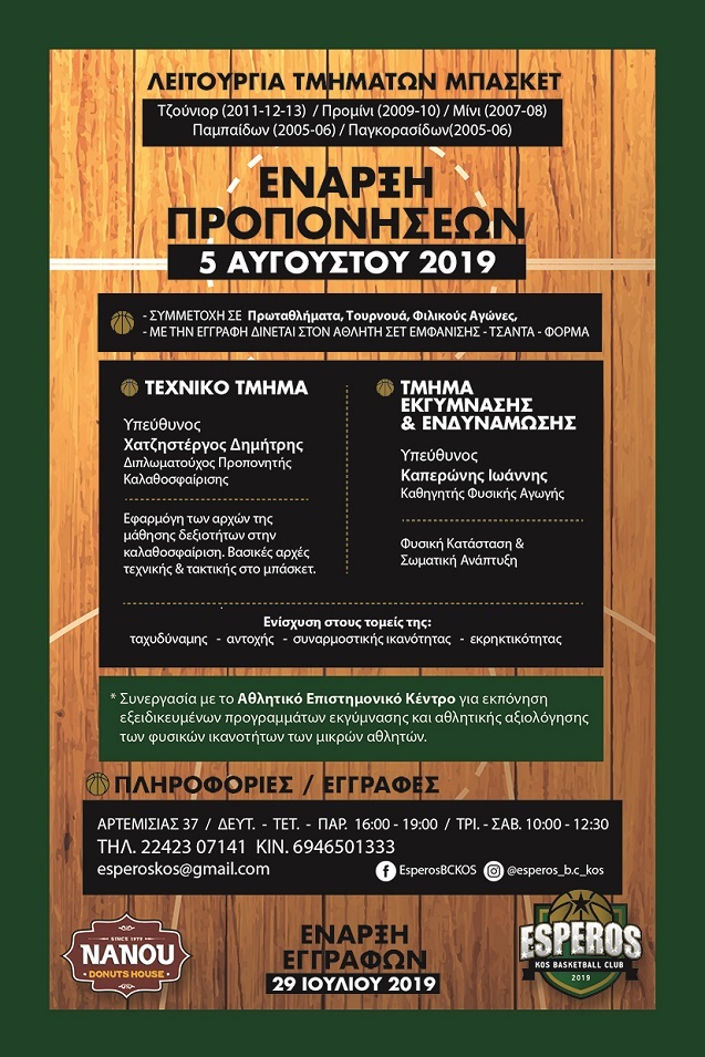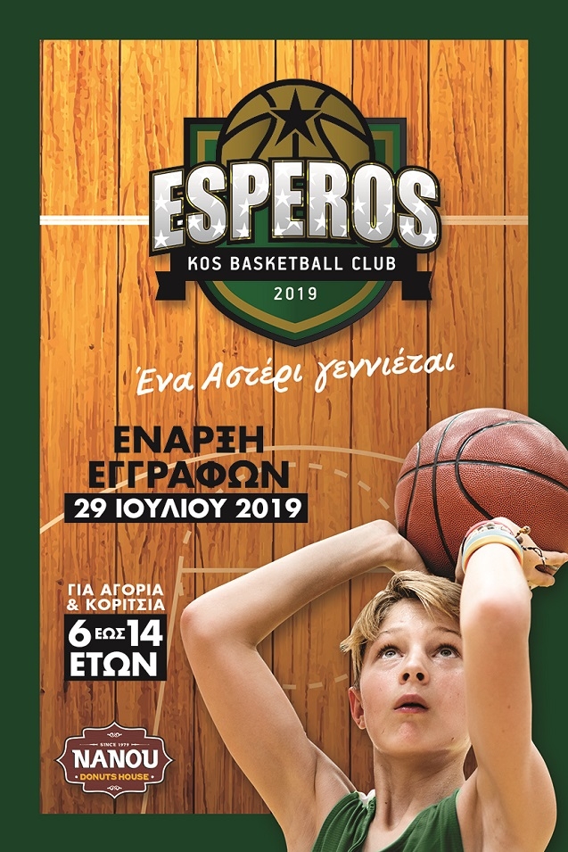 Ο Α.Σ. Έσπερος Κω ανακοινώνει ότι στις 29 Ιουλίου ξεκινάει η έναρξη εγγραφών για τη νέα αγωνιστική περίοδο για αγόρια και κορίτσια ηλικίας 6 έως 14 ετων. Η έναρξη των προπονήσεων θα γίνει στις 5 Αυγούστου και μαζί με την εγγραφή θα δίνεται στους αθλητές σετ εμφάνισης, τσάντα και φόρμα. Για πληροφορίες και εγγραφές κάθε Δευτέρα, Τετάρτη και Παρασκευή από 16:00 εως 19:00 και κάθε Τρίτη και Σάββατο από 10:00 έως 12:30 στα τηλέφωνα 22423-07141 και 6946501333.