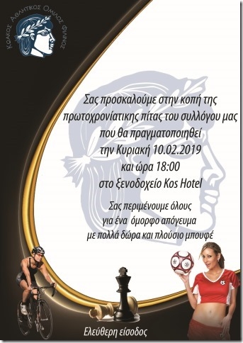 Σας προσκαλούμε στην κοπή της πρωτοχρονιάτικης πίτας του συλλόγου μας που θα πραγματοποιηθεί την Κυριακή 10/2/2019 και ώρα 18:00 στο ξενοδοχείο Kos Hotel. Σας περιμένουμε όλους για ένα όμορφο απόγευμα με πολλά δώρα και πλούσιο μπουφέ.