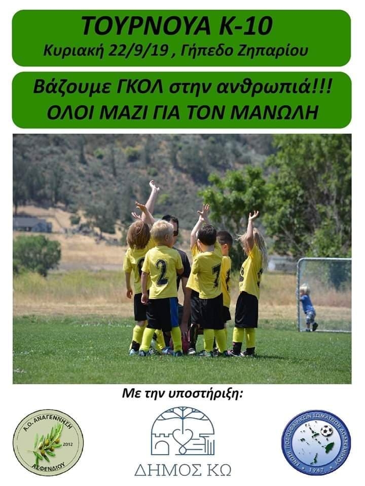 Τουρνουά με απότερο σκοπό την συγκέντρωση χρημάτων, για την ενίσχυση του συμπολίτη μας Μανώλη Ζαϊμάκη , διοργανώνει ο Α.Ο. Αναγεννηση Ασφενδιού, με ανοιχτή πρόσκληση σε όλες τις Ακαδημίες του Βορείου Συγκροτήματος Δωδεκανήσου και την υποστήριξη του Δήμου Κω (Δ.Ο.Π.Α.Β.Σ.) και της Ε.Π.Σ. Δωδεκανήσου.