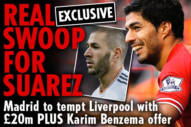 Η “Star” που θεωρείται αξιόπιστη πηγή, έχει σε αποκλειστικότητα το θέμα ότι η “Ρεάλ Μαδρίτης είναι έτοιμη να προσφέρει 20 εκατομμύρια λίρες και τον Καρίμ Μπενζεμά για τον Λουίς Σουάρες της Λίβερπουλ”.