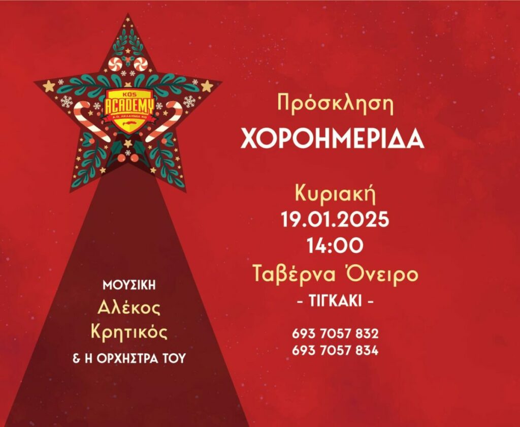 Όπως κάθε χρόνο έτσι και φέτος, ο Αθλητικός Όμιλος Ακαδημία Κω θα πραγματοποιήσει την κοπή της πρωτοχρονιάτικης βασιλόπιτας με τη διοργάνωση χοροημερίδας, την Κυριακή 19 Ιανουαρίου στις 14:00, στο εστιατόριο ΌΝΕΙΡΟ στο Τιγκάκι.