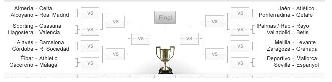 Όσοι ονειρεύονταν τελικό Κυπέλλου Ισπανίας ανάμεσα στη Ρεάλ Μαδρίτης και την Ισπανία και σε ένα clasico που δίνει τίτλο, θα πρέπει να το ξεχάσουν. Κι αυτό γιατί η κληρωτίδα είχε διαφορετική άποψη στις διασταυρώσεις των αναμετρήσεων, έτσι ώστε η μοναδική πιθανότητα να παίξουν οι δύο «μεγάλοι» αντιμέτωποι είναι στα ημιτελικά. Ο Τελικός θα διεξαχθεί στις 18 Μαΐου.