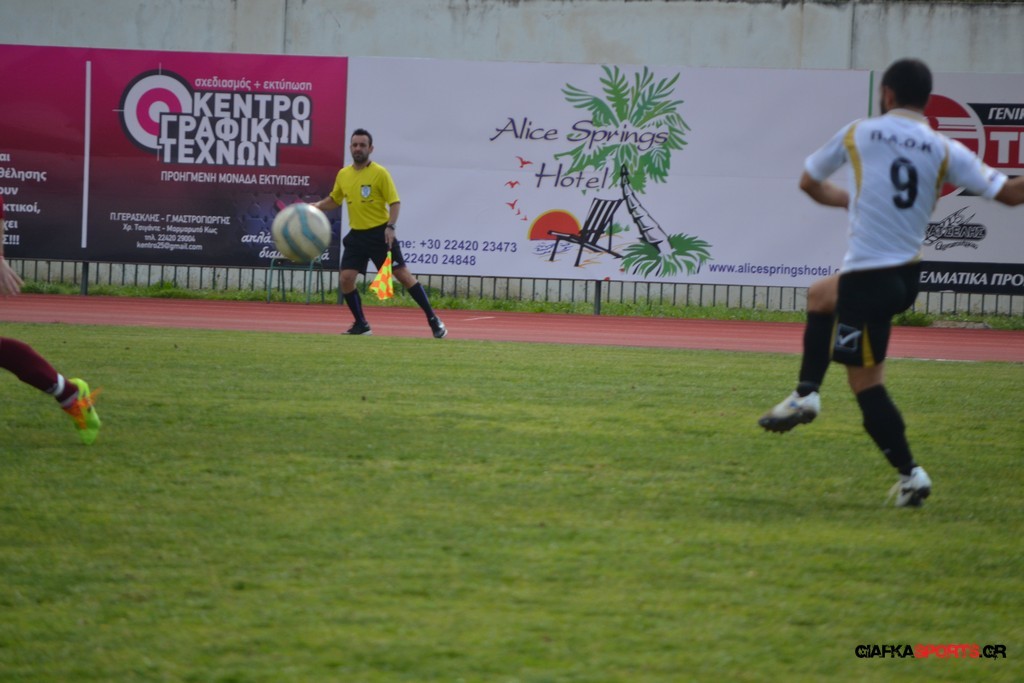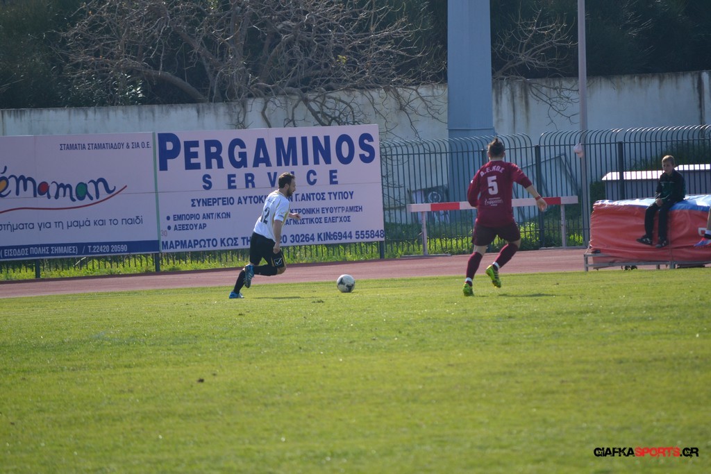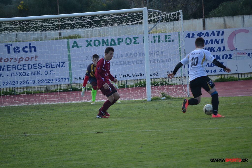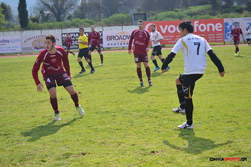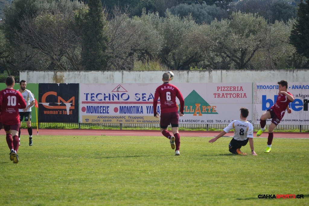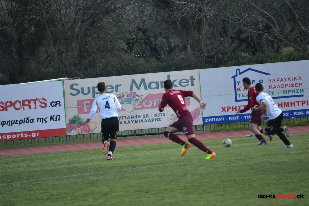 Ο ΠΑΟΚ Κω ήταν απ’ την αρχή του παιχνιδιού ο κυρίαρχος, και αφού προειδοποίησε με Σουλάι και Χατζηλάου, κατάφερε μόλις στο 14ο λεπτό να πάρει προβάδισμα στο σκορ όταν μετά από παράλληλη σέντρα του Χατζηλάου ο Ζαίμι, έστρωσε στον Μικέ Ξυπολιτά και εκείνος δεν δυσκολεύτηκε να ανοίξει το σκορ για το 1-0.