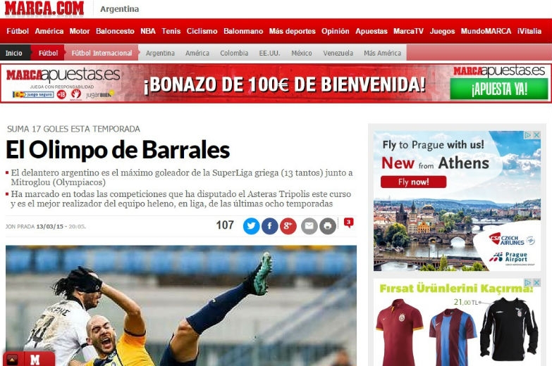 Εκτενές αφιέρωμα στα επιτεύγματα του Χερόνιμο Μπαράλες στην Ελλάδα με τη φανέλα του Αστέρα Τρίπολης φιλοξενεί η ισπανική εφημερίδα, «Marca» με τον Αργεντινό στράικερ να μιλάει για το μεγάλο στόχο των Αρκάδων που είναι η έξοδος στην Ευρώπη.