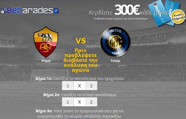 Η πρεμιέρα γίνεται με την αναμέτρηση Ρόμα – Ίντερ ενώ αύριο θα έχετε τη δυνατότητα να αφήσετε το προγνωστικό σας για το σούπερ ντέρμπι ανάμεσα στον Ολυμπιακό και τον Παναθηναϊκό στο στάδιο “Γ. Καραϊσκάκης”.