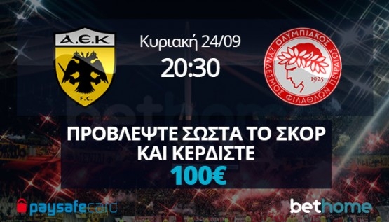 Προβλέψτε σωστά το σκορ του αγώνα της Κυριακής 24/9 στις 20:30 μεταξύ της ΑΕΚ και του Ολυμπιακού και κερδίστε 100 ευρώ σε Paysafe Cards!