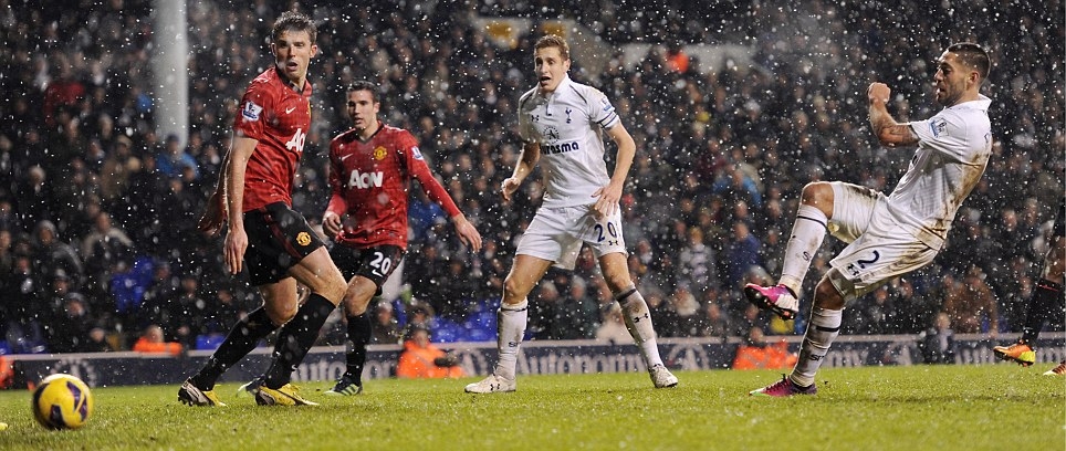 Με τον Ρόμπιν Φαν Πέρσι στην επίθεση της Μάντσεστερ Γιουνάιτεντ, πλέον καμία ομάδα δεν μπορεί να γνωρίζει αν θα πάρει τελικά ό,τι διεκδικεί στον αγωνιστικό χώρο. Με το χιόνι να πέφτει ασταμάτητα, η Τότεναμ κατάφερε να ελέγξει το ρυθμό του αγώνα, να κυκλοφορήσει τη μπάλα, να φανεί καλύτερη από τους «κόκκινους διαβόλους», αλλά οι οπαδοί της, περισσότερο ανησύχησαν παρά απέκτησαν αισιοδοξία. Στο 12ο λεπτό, ο Φαν Πέρσι έστειλε άουτ τη μπάλα από σέντρα του Τζόουνς και ουσιαστικά, έδειξε τι θα συμβεί στη συνέχεια. Μπορεί ο Ντε Χέα να κλήθηκε να κάνει διπλή επέμβαση σε σουτ του Λένον στο 13′ και χλιαρό πλασέ του Ντεφό στην επαναφορά (με τον Άγγλο να υποδεικνύεται σε θέση οφσάιντ), όμως οι παίκτες του Φέργκιουσον θα έβρισκαν τη λύση. Στο 25′, λοιπόν, από σέντρα του Κλέβερλι, ο Φαν Πέρσι έκανε σωστά την κεφαλιά και έγραψε το 1-0. Θα ήταν ό,τι καλύτερο για την Τότεναμ να ισοφαρίσει άμεσα, αλλά ο Ντεφό είδε τον Ντε Χέα να του λέει όχι στην αμέσως επόμενη φάση μετά το γκολ, ενώ ο Ισπανός πορτιέρο αρνήθηκε το γκολ και στον Μπέιλ, στο 41ο λεπτό.