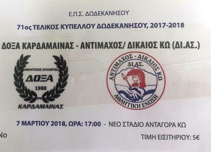 Εν όψει του 71ου τελικού Κυπέλλου της Ε.Π.Σ. Δωδεκανήσου, ανάμεσα στην ομάδα μας και την Α.Ε ΔΙ.ΑΣ, την Τετάρτη 7 Μαρτιού και ώρα 5μ.μ στο Νέο Στάδιο “Ανταγόρας” και για την ομαλή προσέλευση των φιλάθλων, ο Α.Σ ΔΟΞΑ ΚΑΡΔΑΜΑΙΝΑΣ ανακοινώνει πως: