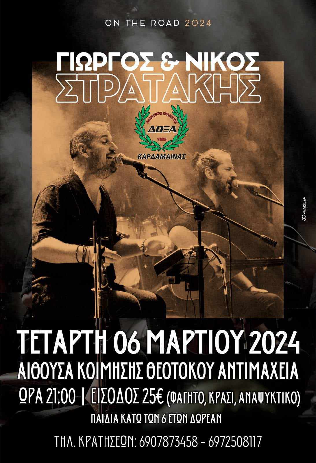 Μουσική βραδιά διοργανώνει η Δόξα Καρδάμαινας με καλεσμένους τον Γιώργο και το Νίκο Στρατάκη την Τετάρτη 6 Μαρτίου στις 21:00 στην αίθουσα κοίμησης της Θεοτόκου στην Αντιμάχεια.