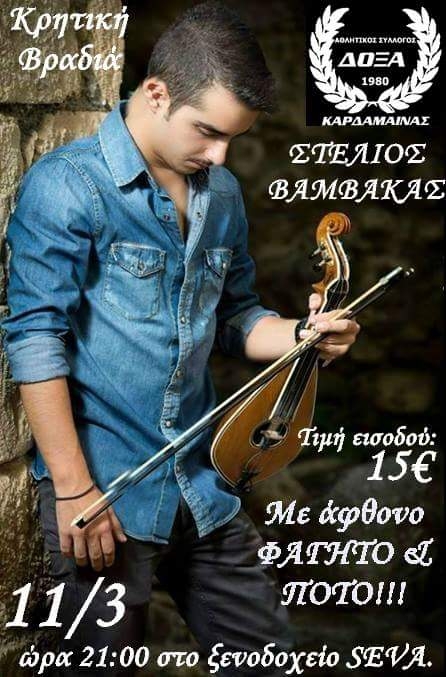 Ο ΑΣ. ΔΟΞΑ ΚΑΡΔΑΜΑΙΝΑΣ διοργανώνει Κρητική Βραδιά στις 11/3 Παρασκευή με τον αγαπημένο μας Στέλιο Βαμβακά, στο ξενοδοχείο SEVA στη ΚΑΡΔΑΜΑΙΝΑ.